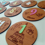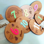 De madera dm laminado blanco y apliques de metacrilato colores pastel con imanes para facilitar el cambio de números según mes a celebrar.