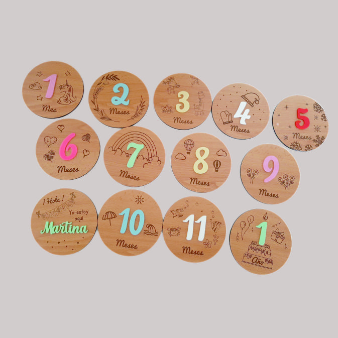 Diseños diferentes cada mes Set de 13 placas p/fotos Madera dm natural y metacrilato colores a elegir