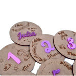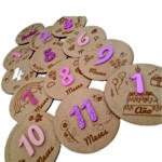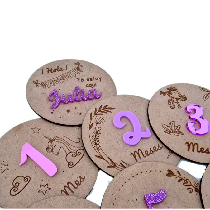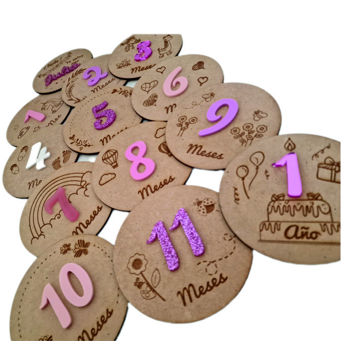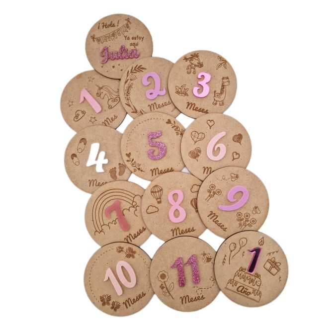 Diseños diferentes cada mes Set de 13 placas p/fotos Madera Haya  y apliques en metacrilato  opcional mismo color o diferentes